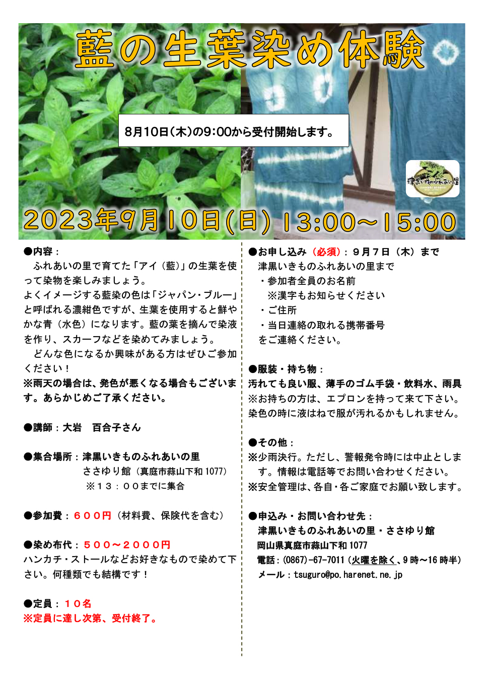 ふれあいの里で育てた「アイ(藍)」の生葉を使って染物を楽しみましょう。※雨天の場合は、発色が悪くなる...