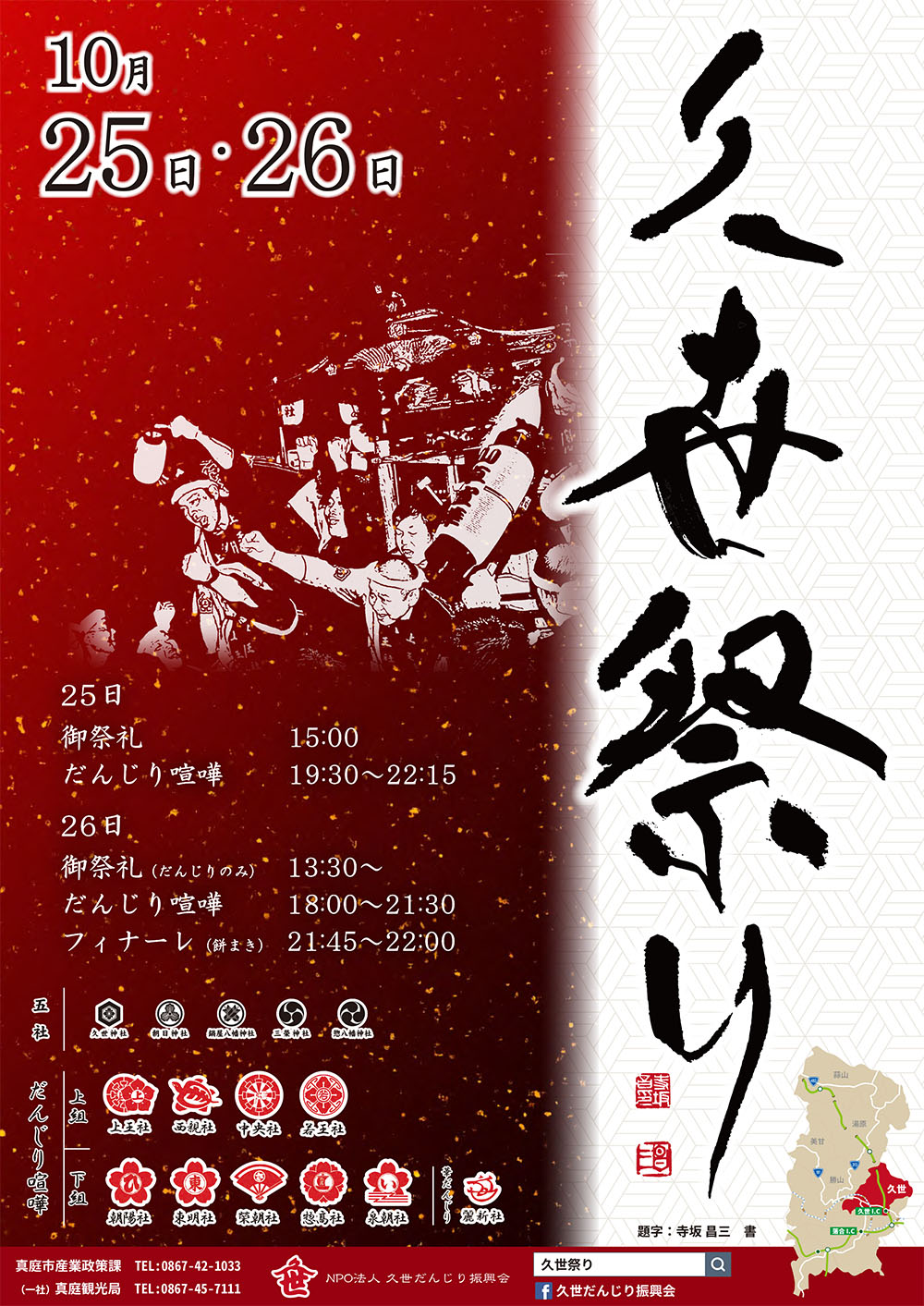 四年ぶりの通常開催となる久世祭り。5社の御輿と10社のだんじりが旧出雲街道を巡行します。【宵祭り】1...