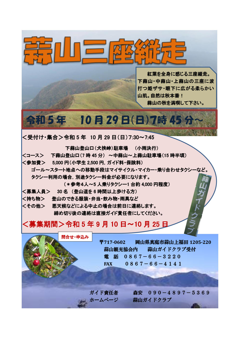 【日程】令和5年10月29日(日)【時間】(受付)7:30~7:45【集合場所】下蒜山登山口(犬挟峠...