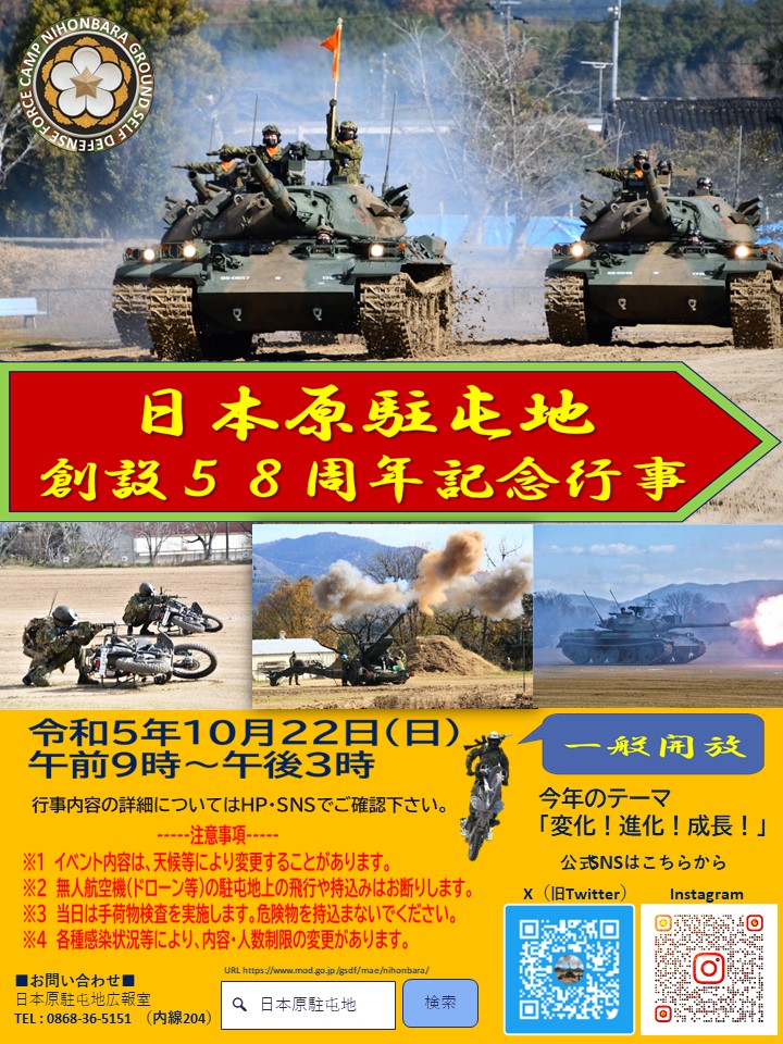 【日程】令和5年10月22日(日)【時間】午前9時~午後3時 一般開放【会場】陸上自衛隊 日本原駐屯...