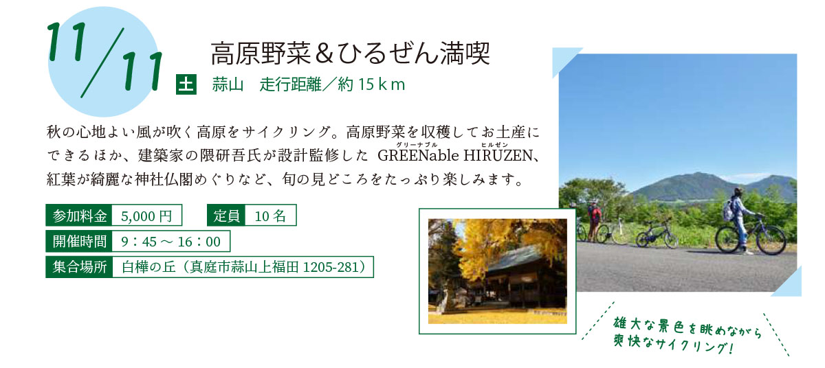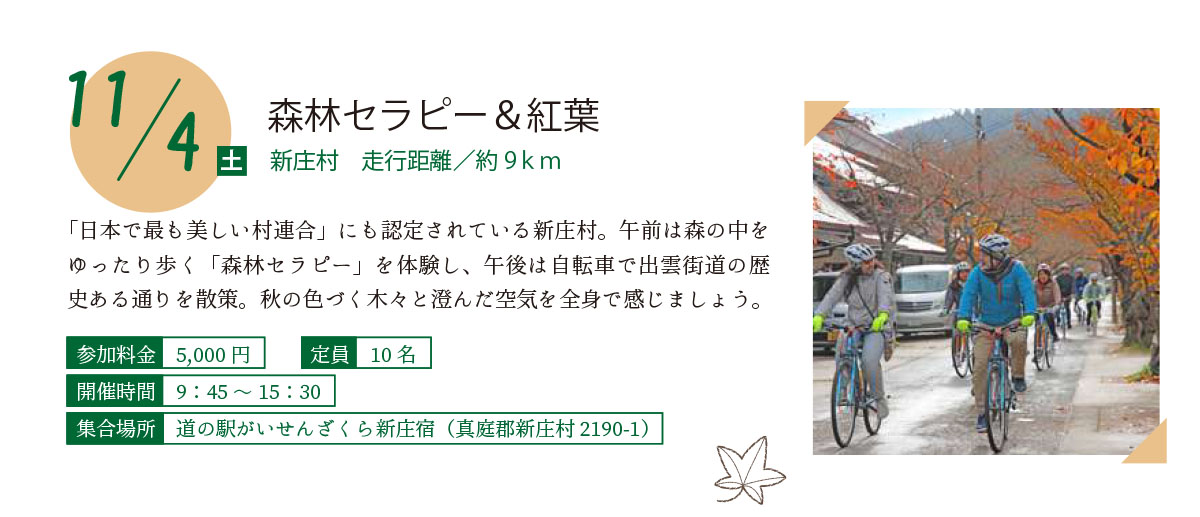 【日程】2023年11月4日(土)【時間】9:45~15:30【集合場所】道の駅がいせん桜新庄宿(岡...