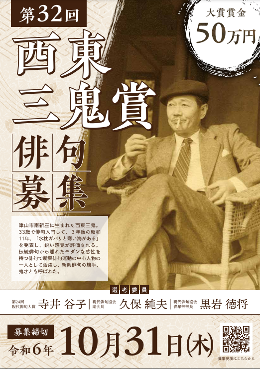 【募集期間】令和6年(2024年)10月31日(木曜日)まで 当日消印有効【応募先】西東三鬼賞委員会...