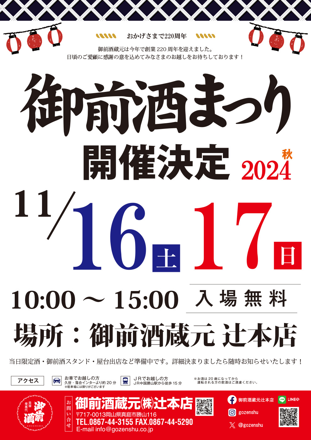 【日程】2024年11月16日(土)、17日(日)【時間】10:00~15:00【会場】御前酒蔵元 ...