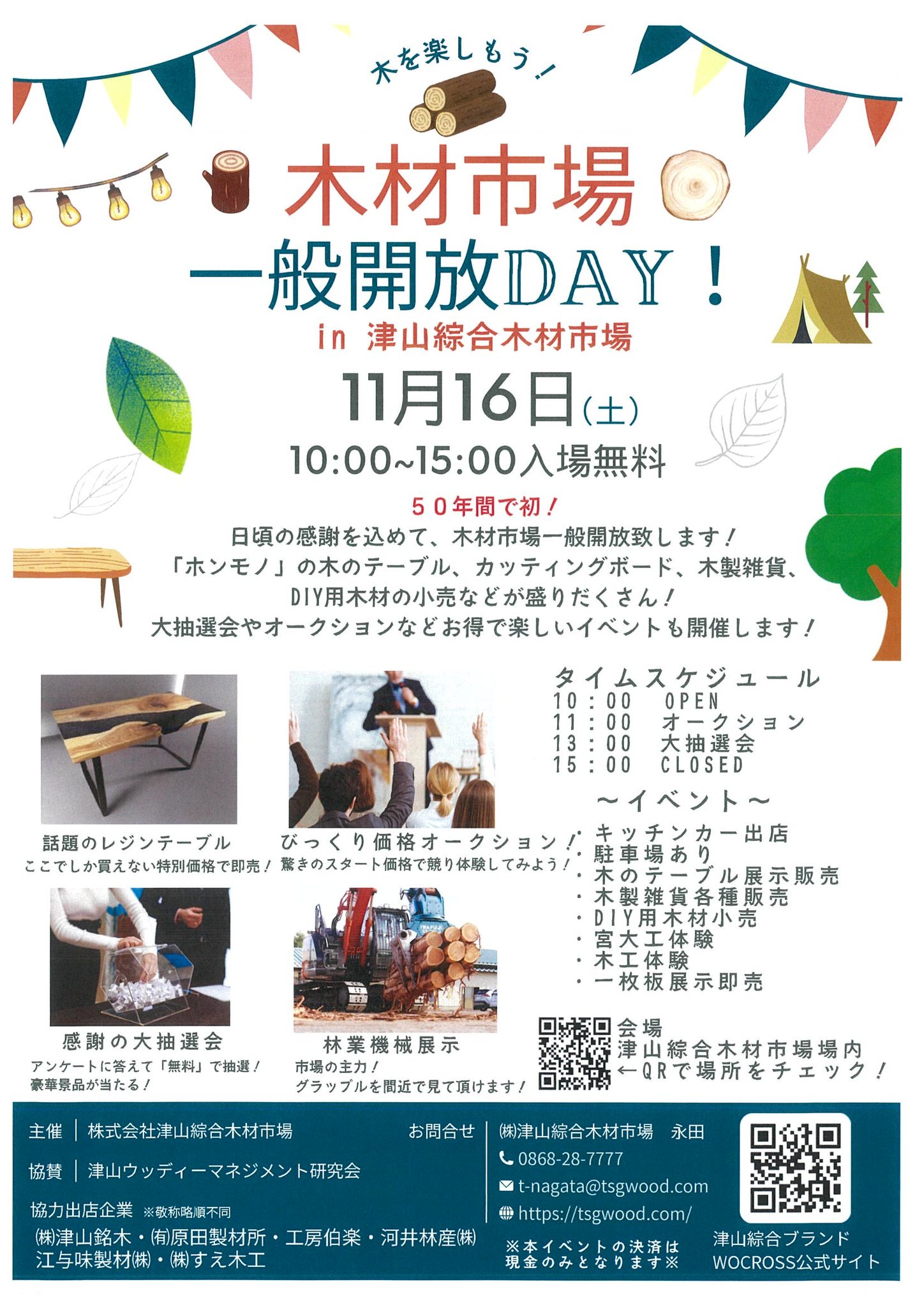 【日程】2024年11月16日(土)【時間】午前10時~午後3時【会場】津山綜合木材市場(津山市上田...