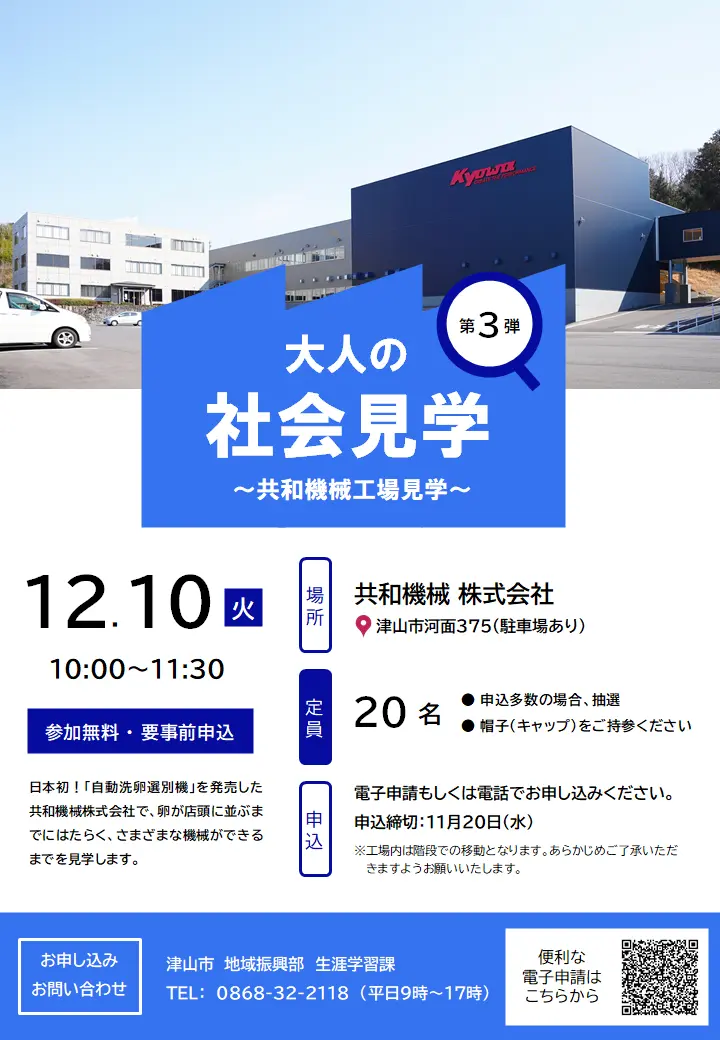 【日程】2024年12月10日【時間】 10:00~11:30【会場】共和機械株式会社(津山市河面3...