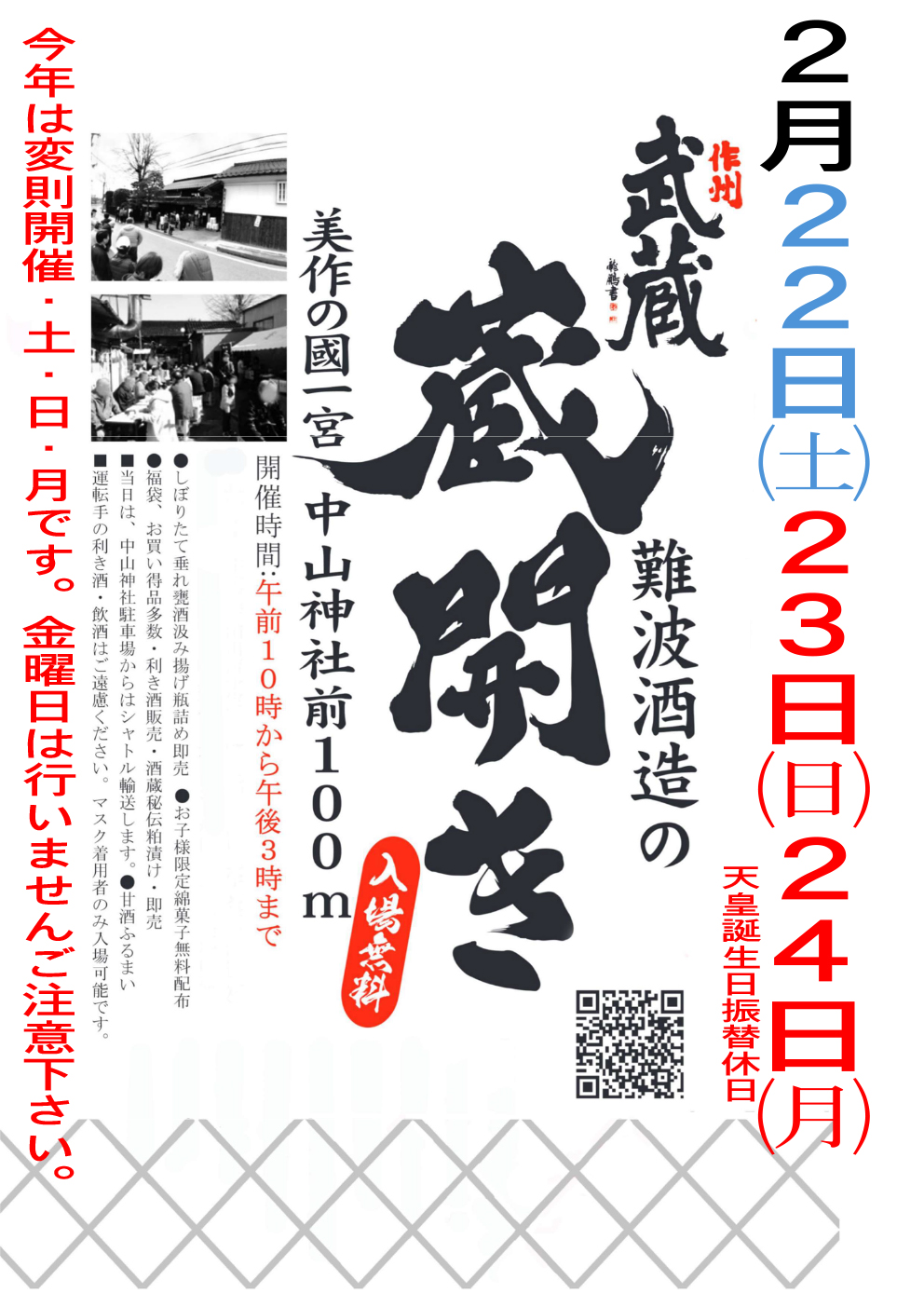 【日程】2025年2月28日(金)~3月3日(月)【時間】10時~15時【会場】御前酒蔵元辻本店 蔵...