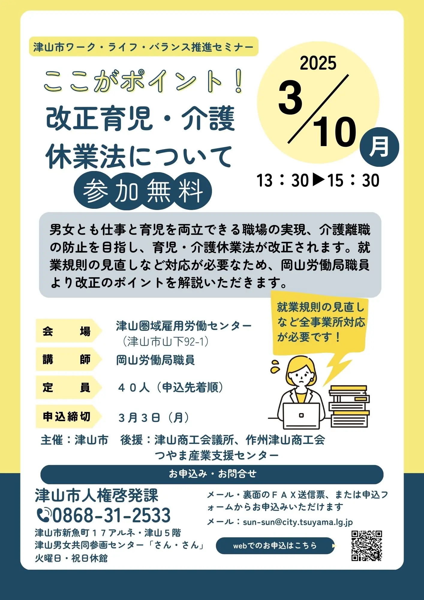 【日程】令和7年3月10日月曜日【時間】午後1時30分から午後3時30分【会場】津山圏域雇用労働セン...