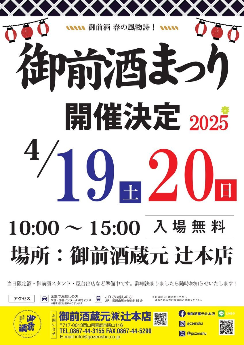 【日程】2025年4月19日(土)・20日(日)【時間】10:00~15:00【会場】御前酒蔵元辻本...