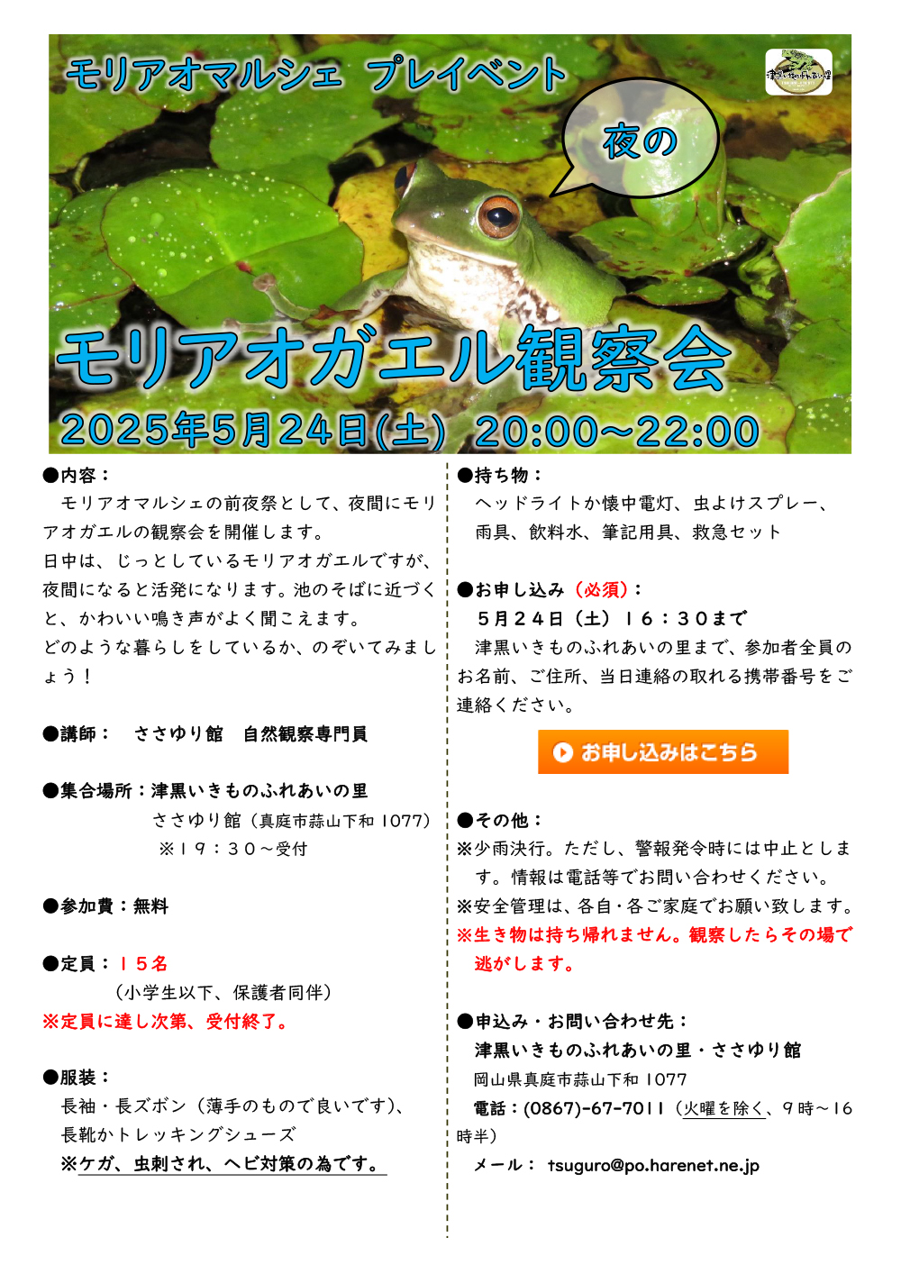 【日程】2025年5月24日(土)【時間】20:00~22:00【場所】津黒いきものふれあいの里(真...