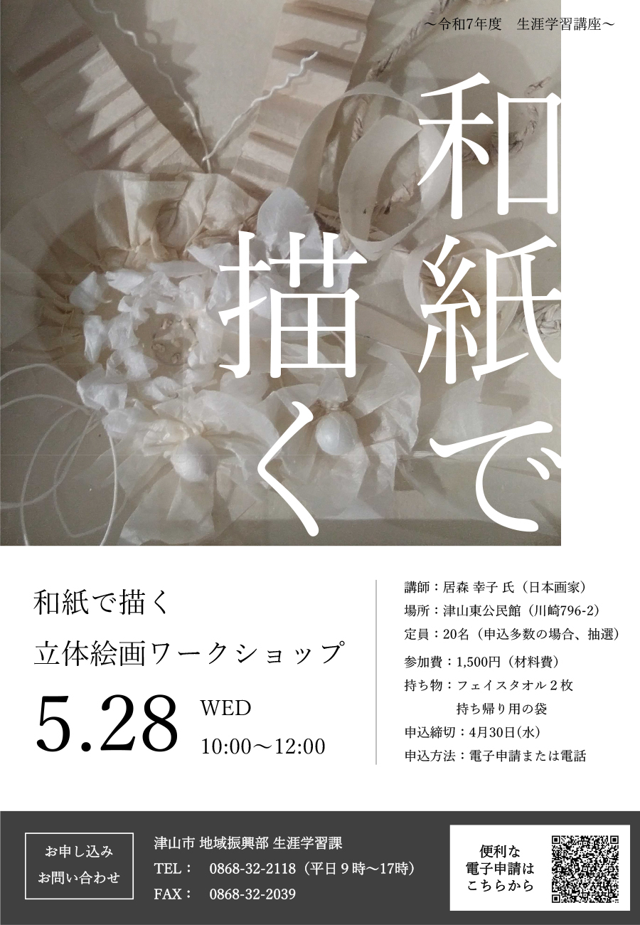 【日程】令和7年5月28日(水)【時間】10:00~12:00【会場】津山東公民館(津山市川崎796...