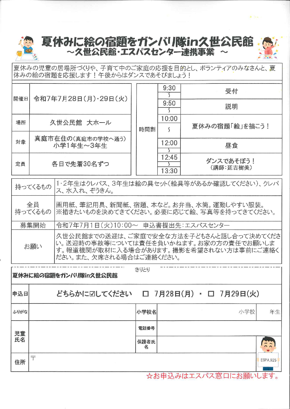 【日程】2025年7月28日(月)・29日(火)【時間】9:30 受付9:50 説明10:00 夏休...