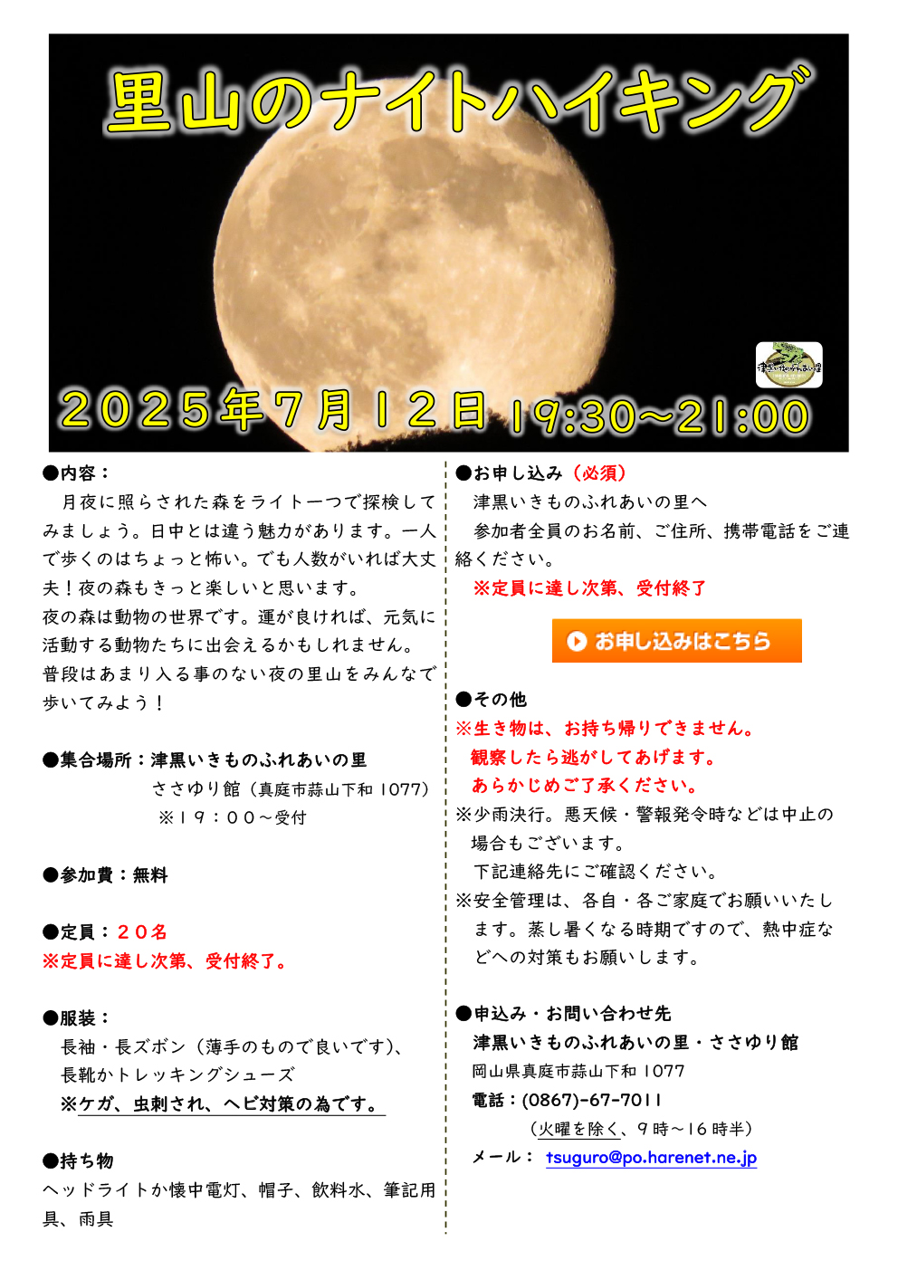 【日程】7/12(土)【時間】19:30-21:00【集合場所】津黒いきものふれあいの里 ささゆり館...