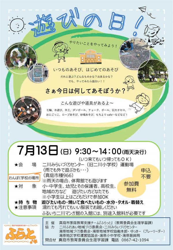 【日程】令和7年7月13日(日曜日)【時間】午前9時30分~午後2時 ※雨天の場合は体育館で遊びます...
