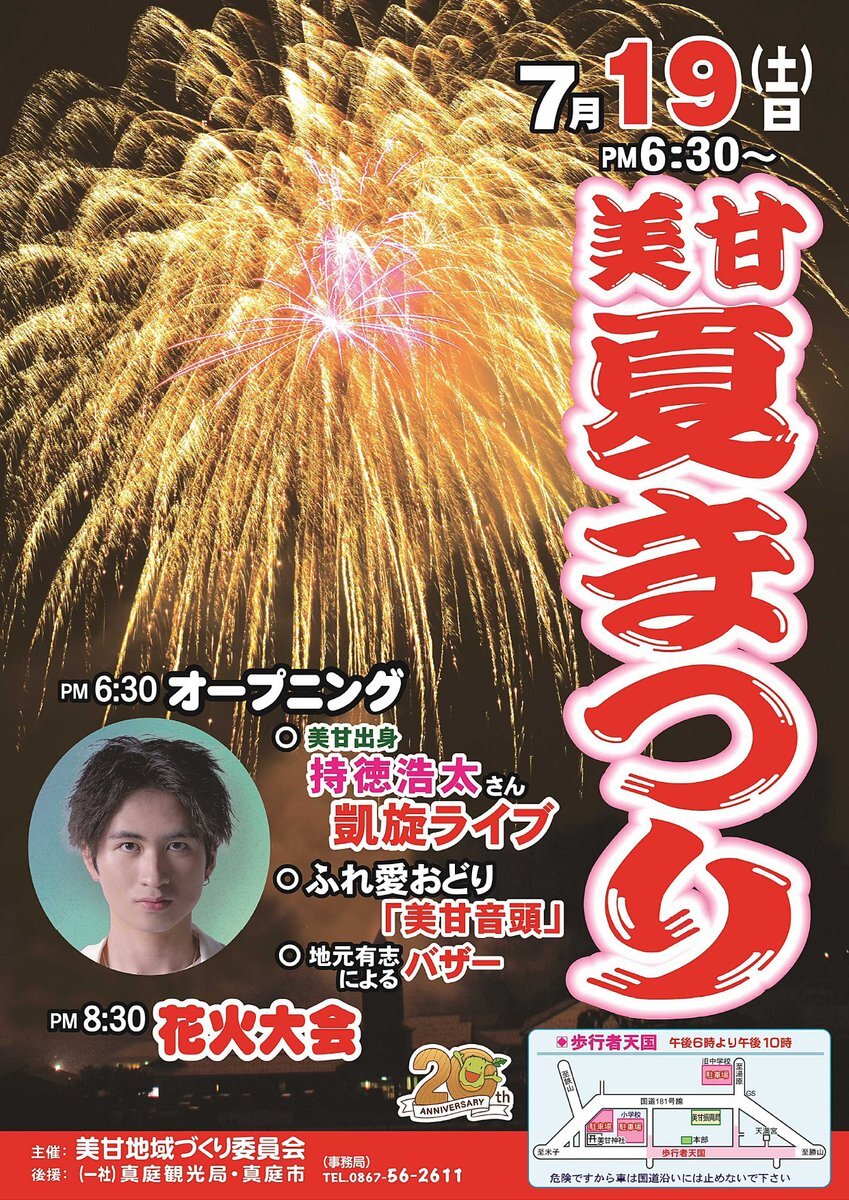 【日程】2025年7月19日(土)【時間】19:00~ ※花火大会は20:30~【会場】美甘中心部(...