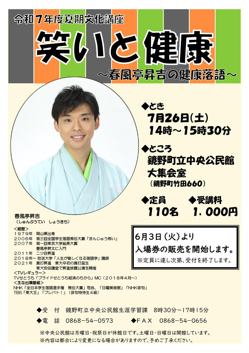 【日程】令和7年7月26日土曜日【時間】14時00分~15時30分(開場:13時00分)【会場】鏡野...