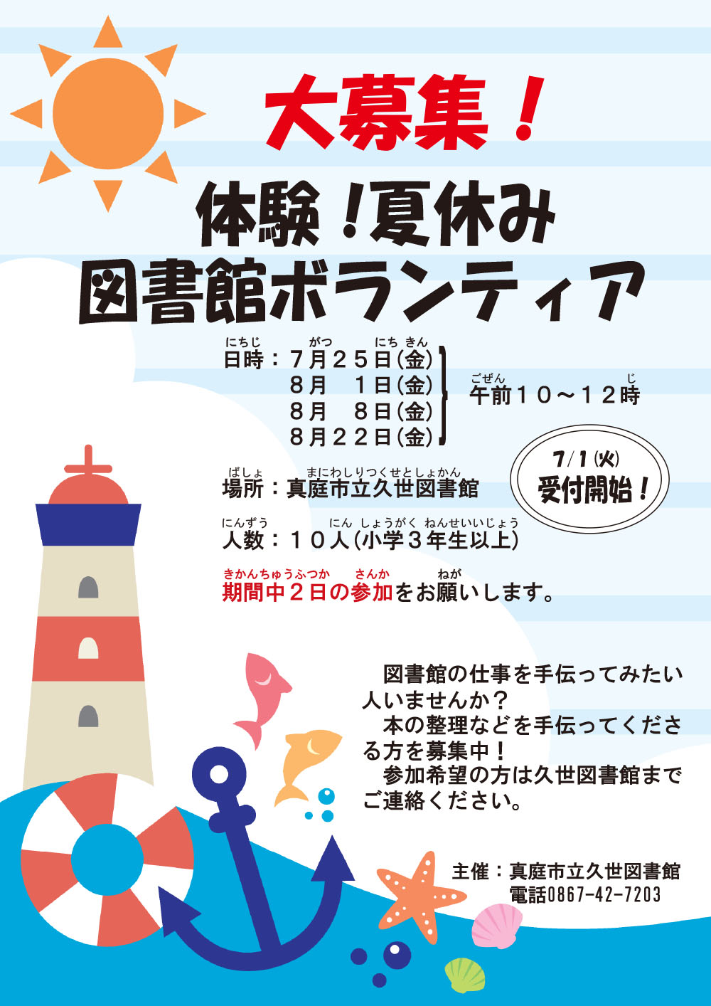 【日程】7月25日・8月1日・8日・22日(金)【時間】午前10時~午前12時【会場】久世図書館(真...