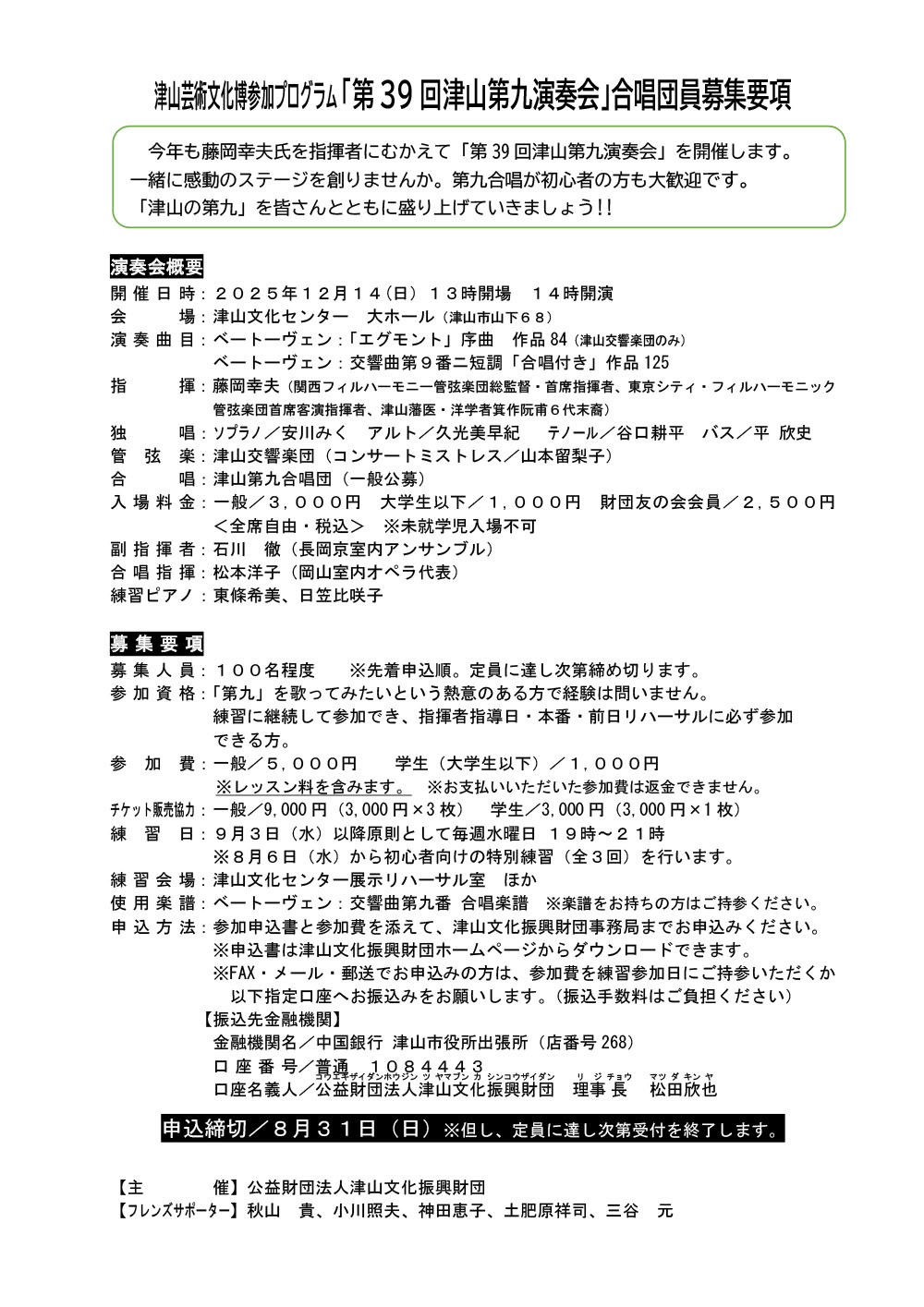 今年 12月14日開催の「第39回 津山第九演奏会」に出演する合唱団員を募集します。【対象】「第九」...