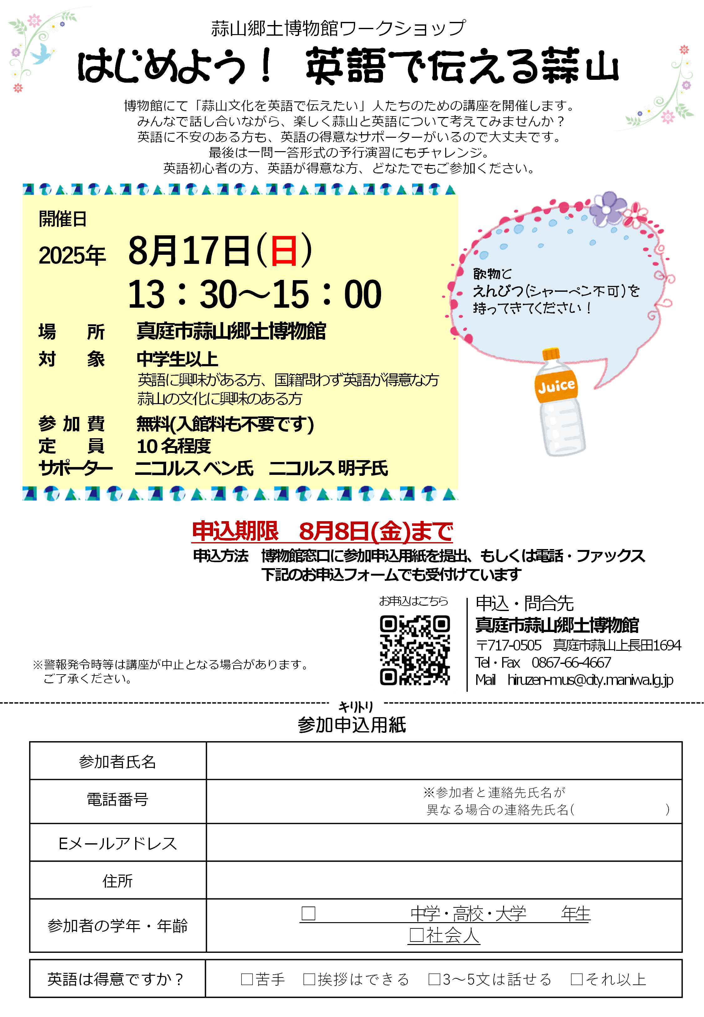 【日程】令和7年8月22日(金)【時間】午前10時~正午【会場】津山中央公民館(津山市大谷600)【...